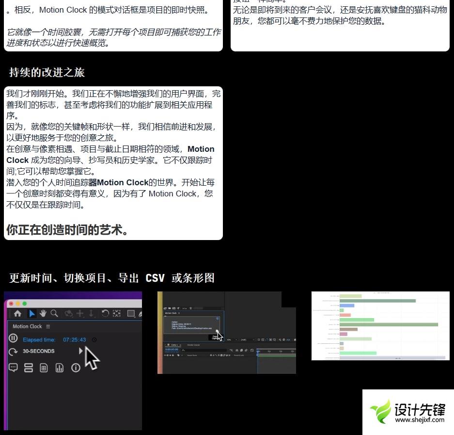 使用 Motion Clock脚本在所有 Adobe Creative Suite 应用程序(After Effects、Illustrator、Photoshop 和 Premiere Pro)中实时准确跟踪和导出(条形图和 CSV)项目小时数。它直观、不显眼,并毫不费力地与您的工作流程同步。Motion Clock确保每一分钟都很重要。不要只跟踪时间,掌握它。