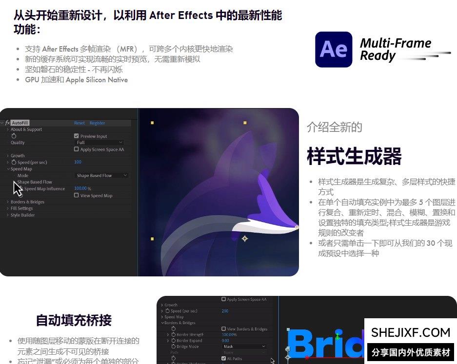 AutoFill是After Effects的一个革命性新插件,可以流畅地填充图层的边界,从而节省了数小时的繁琐蒙版和关键帧。AutoFill 插件提供了多种自动填充选项,包括文本、形状、图像和效果等。用户只需输入一次内容,AutoFill就可以自动在动画中生成连续的填充效果,非常方便实用。此外,AutoFill还支持自定义填充模式和参数,以满足不同的创意需求。无论是制作循环动画、背景效果还是其他重复性的动画元素,AutoFill都可以帮助用户快速完成。AutoFill v2现在拥有最先进的计算缓存和MFR多帧渲染本机兼容性!