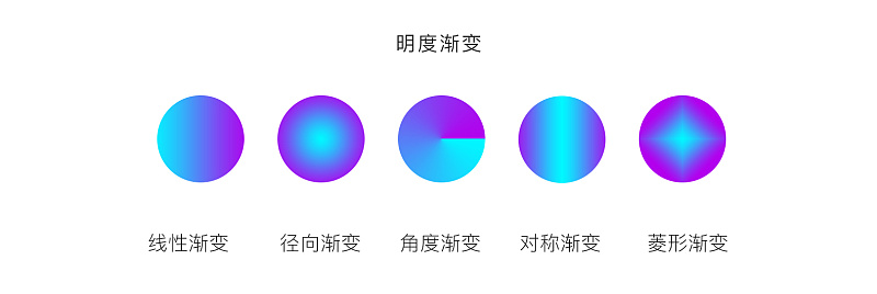 这里我们简单做个介绍,渐变色有五种形式,线性渐变、径向渐变、角度渐变、对称渐变、菱角渐变。在日常设计工作中线性渐变、径向渐变用的较多(如下图)。