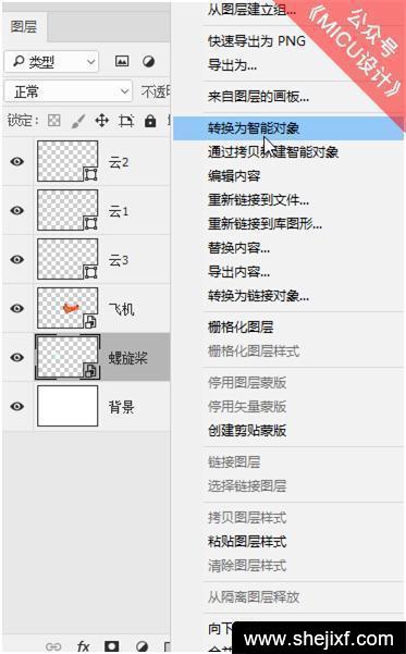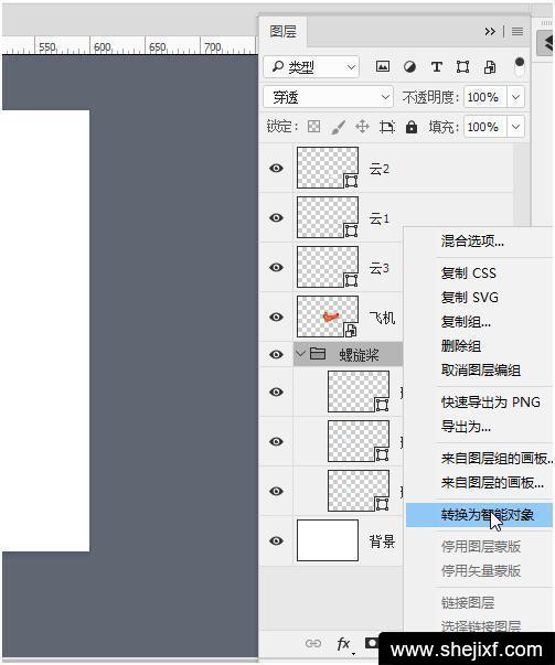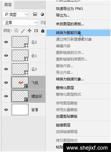 按住Shift键同时选择“飞机”、“螺旋桨”图层,然后鼠标右键选择“转换为智能对象”,此时我们发现两个图层合并成一个图层。