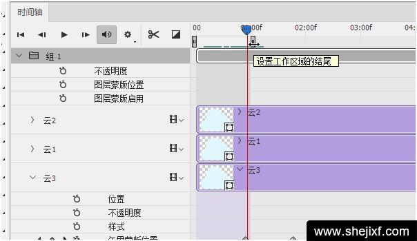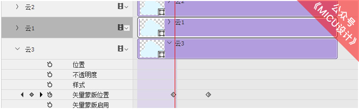 选择“云3”时间轴,然后单击“矢量蒙版位置”,并适当调整云朵的位置,接着将“当前时间指示器”拖曳到10f帧位置,最后继续调整云朵位置。