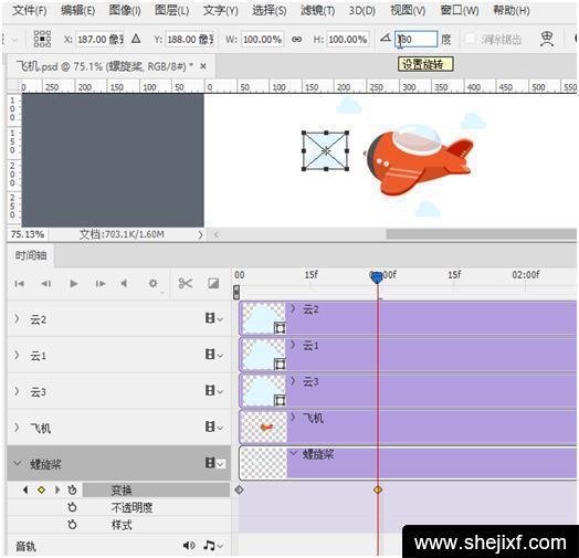 将时间轴上的指示器拖到2:00f位置,再次按Ctrl+T组合键进行180度调整。螺旋桨就可以完成一个360度旋转的动画效果。