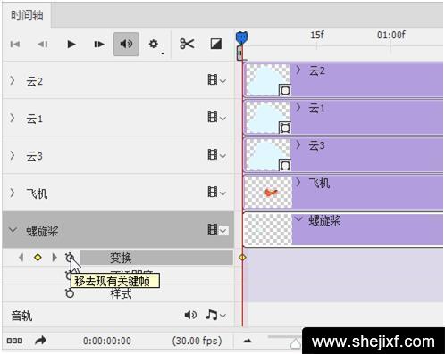 适当的调整飞机的上下位置,在时间轴中适当的位置添加关键帧。