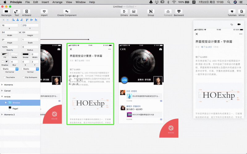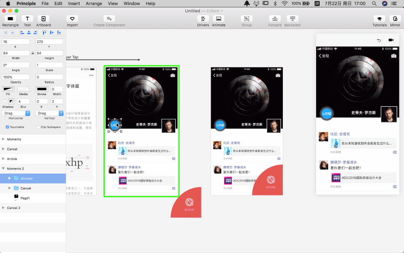 在 Article 画板中新建一个矩形 (快捷键 R),将它移动到导航栏中的 “X” 图标位置,点击矩形旁的闪电图标后,选择「Tap」 并按住鼠标左键不放,将蓝色的链接线指向 Moments2 画板后松开鼠标,这样就实现了关闭/返回的交互。