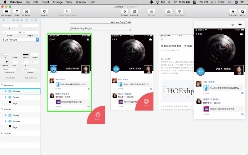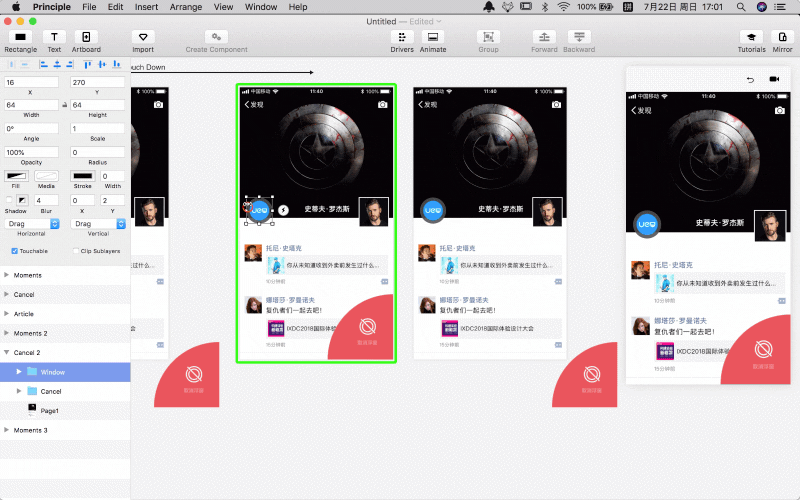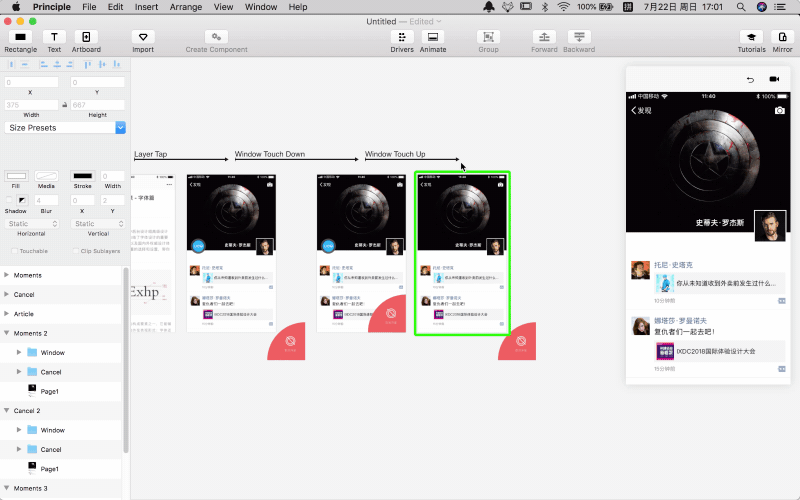 选中 Cancel 画板,command+d 原位复制,将 Cancel2 画板至于最底部。选中 Cancel2 与其他画板的链接线 (Window Drag Ends),右击选择「Delete Event」删除它。在 Moments2 画板中选中浮窗元素 (Window),点击浮窗旁的闪电图标后,选择「Touch Down」 并按住鼠标左键不放,将蓝色的链接线指向 Cancel2 画板后松开鼠标,这样就实现了触摸按下的效果。