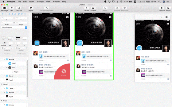 选中 Moments 画板中的浮窗元素,点击闪电图标后,选择「Tap」 并按住鼠标左键不放,将蓝色的链接线指向 Article 画板后松开鼠标,这样就实现了点击跳转效果。不过这样的跳转非常生硬和突然,需要给它加上过渡效果。