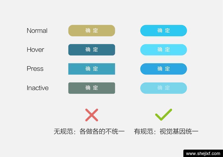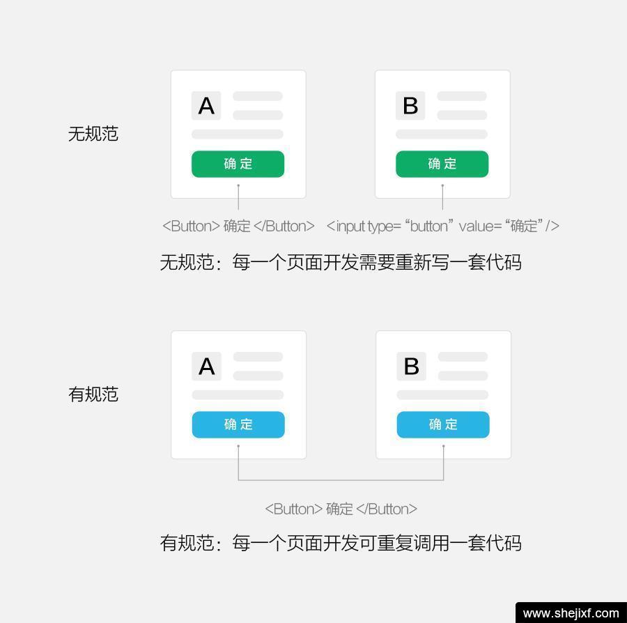 如果没有做规范,就拿按钮这个常见的控件来举例,程序员不知道具体的规范,每个程序员用代码写了A页面的按钮样式,然后在开发B页面时又要重新用代码写按钮样式,页面越多程序员的工作量也就越大,影响项目进度,代码也会越来越臃肿。