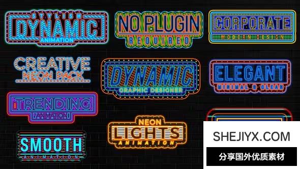 模板 Neon Light Text Pack 包含10种霓虹灯效果文字动画,可以自定义文本内容,使用简单,替换文字即可生成,然后根据需要喜好进行进一步调整。