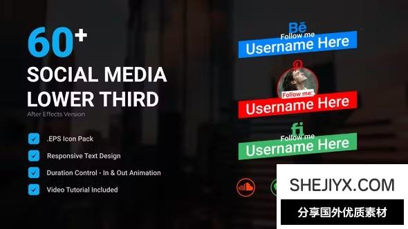 此项目包含60种社交媒体字幕条标题动画。可以调整图像替换为您的照片或其他媒体图像。文本内容可修改。EPS媒体图标文件可调整任意大小不影响质量。响应式设计,包含出入动画,使用简单,轻松调整输出时间,文本样式,颜色等。