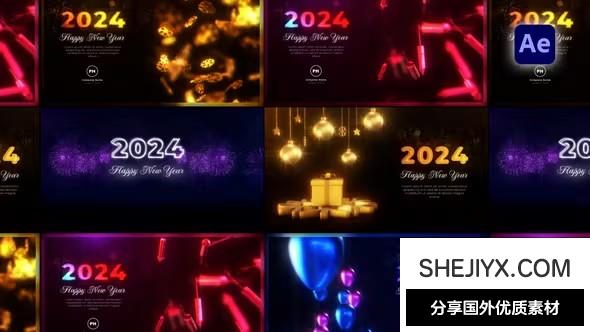 New Year Greetings Pack 包含5种动画场景,可用于制作2024新年快乐问候祝福展示动画。可以更改颜色、发光、文字等。