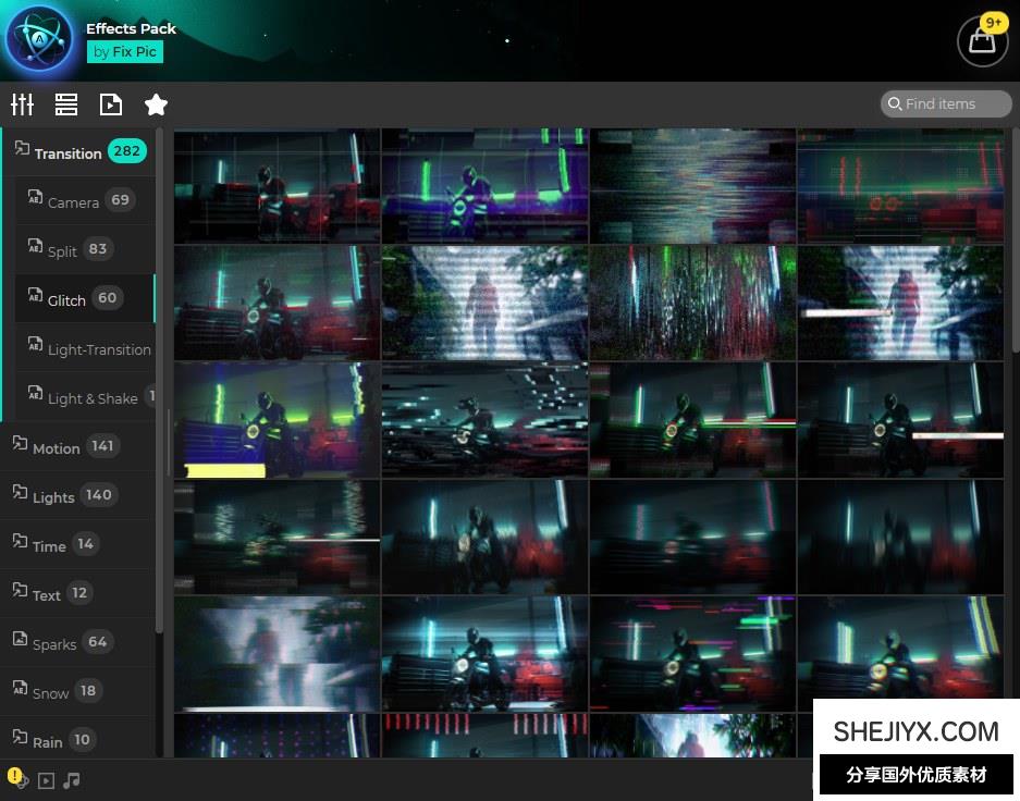 282个视频转场:无缝、摄像机聚焦、分屏切割、信号损坏、光效、抖动等