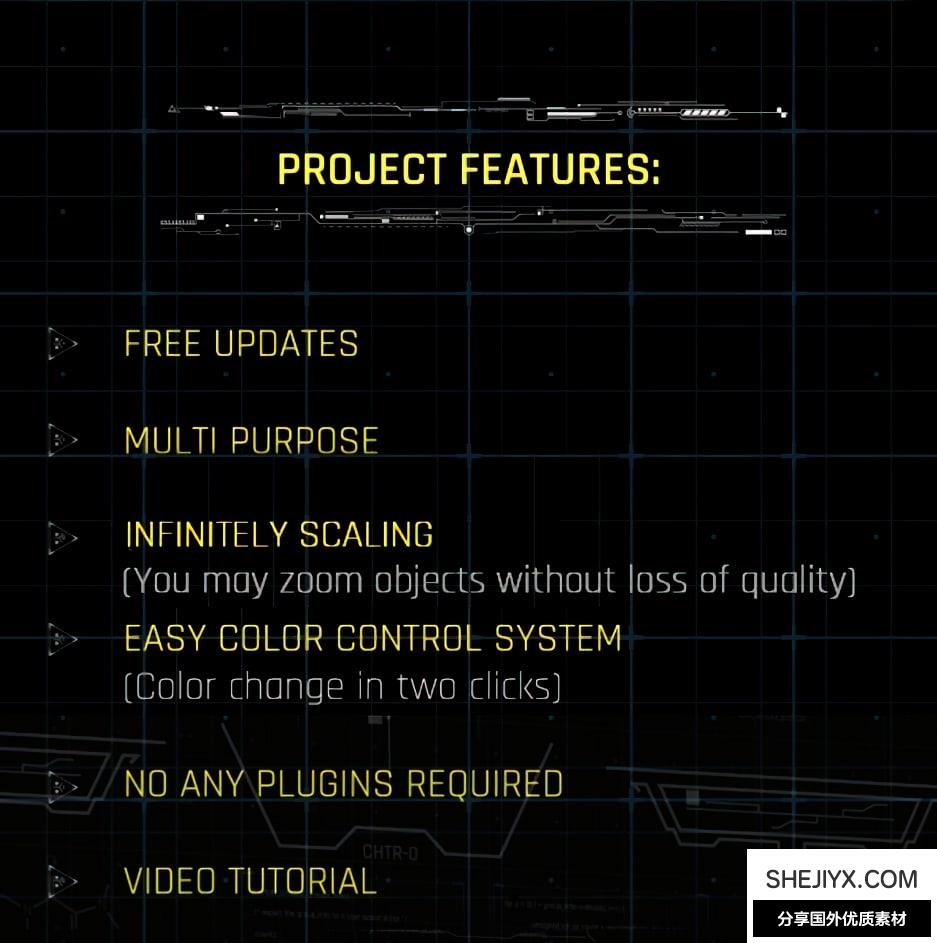 Pro HUD Elements Pack 所有元素是基于矢量文件(不包括预渲染)制作的,这使得它们可以无限缩放而不会损失质量。您的作品可以采用任何分辨率 – 质量将始终保持高水平!所有元素都有 Alpha 透明度通道。您只需将元素拖放到视频中即可获得结果!颜色控制允许您单击两次即可更改元素的颜色!所有元素都按组排列。您在项目中找到所需的元素并不困难。包含易于理解的视频教程