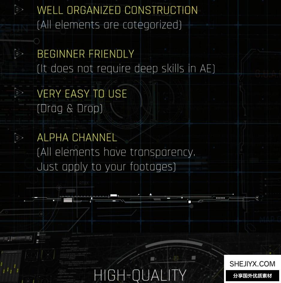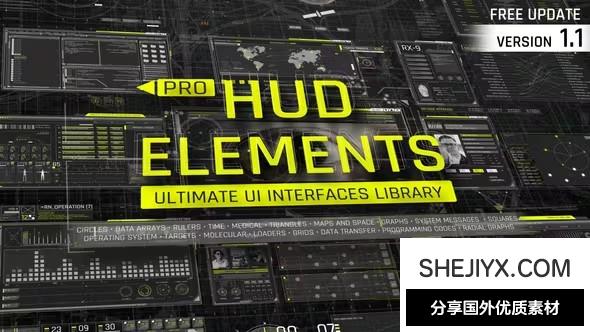 Pro HUD Elements Pack 是一组即用型未来图形元素、技术显示、图标、加载程序、地图等等…华丽的设计和每个元素的个性化方法使这套工具成为创建您自己的奇妙界面的独特工具。非常适合未来电影、视频、游戏、演示等。