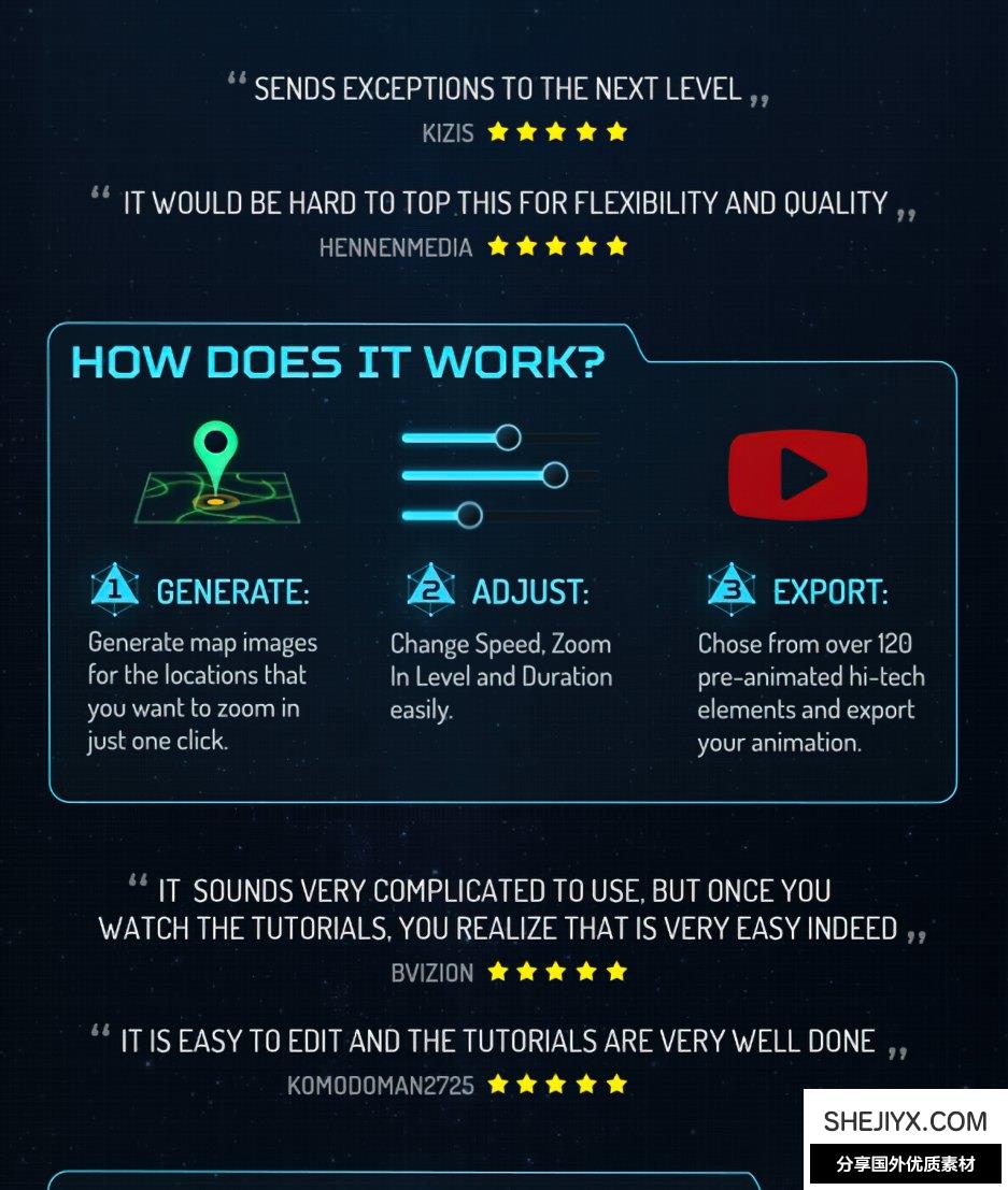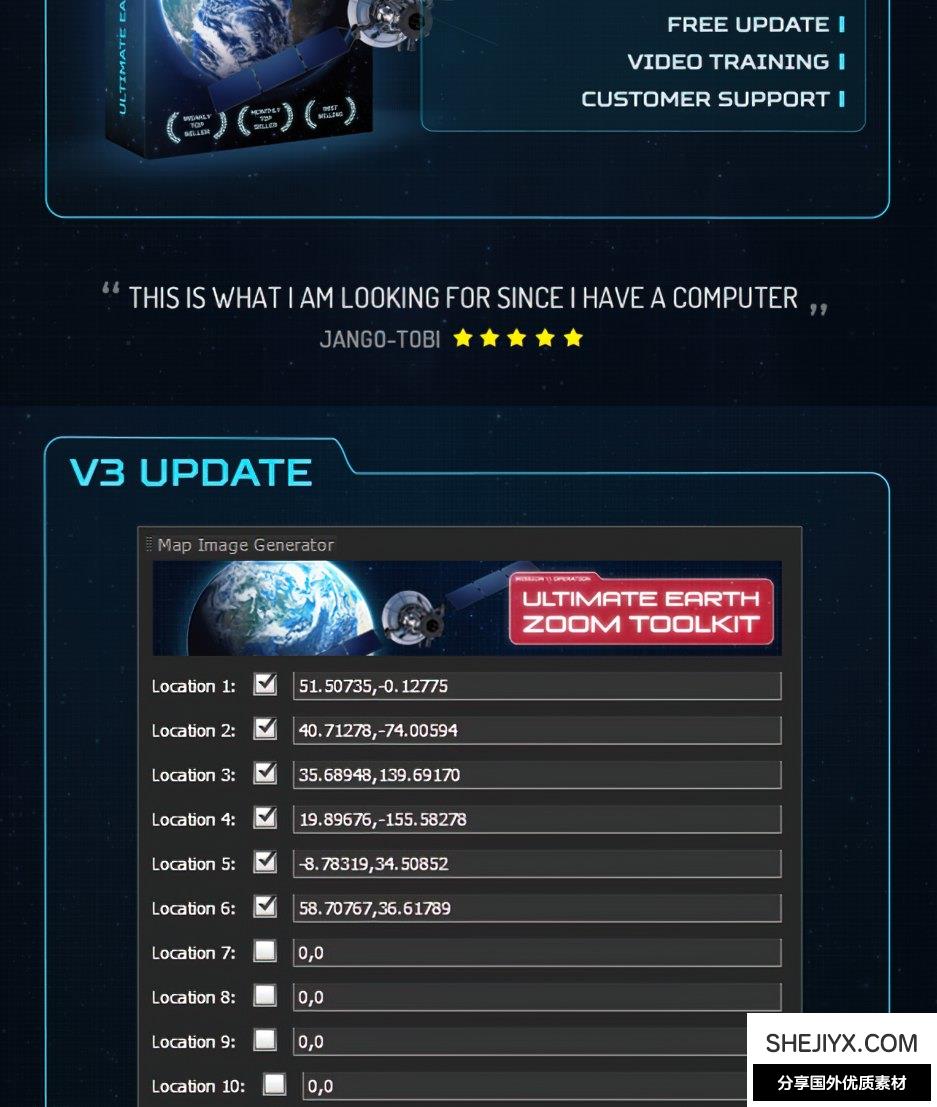 Ultimate Earth Zoom Toolkit:这是主模板。它结合了所有地图图像,让您可以缩放地球上的任何位置。它有一个简介(卫星场景)和一个结尾(徽标展示场景)。还包括高科技图形库。