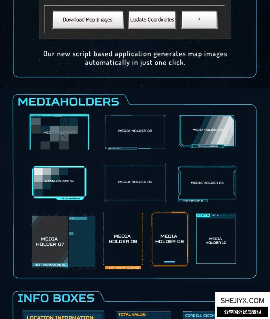 Hi-Tech Library:这是一个独立的高科技元素。您可以将该库导入到您的其他项目中。有超过 100 个高科技元素可供使用。所有元素均与音效同步。标题:以令人惊叹的太空背景显示您的文本。有 10 个可编辑的文本容器。