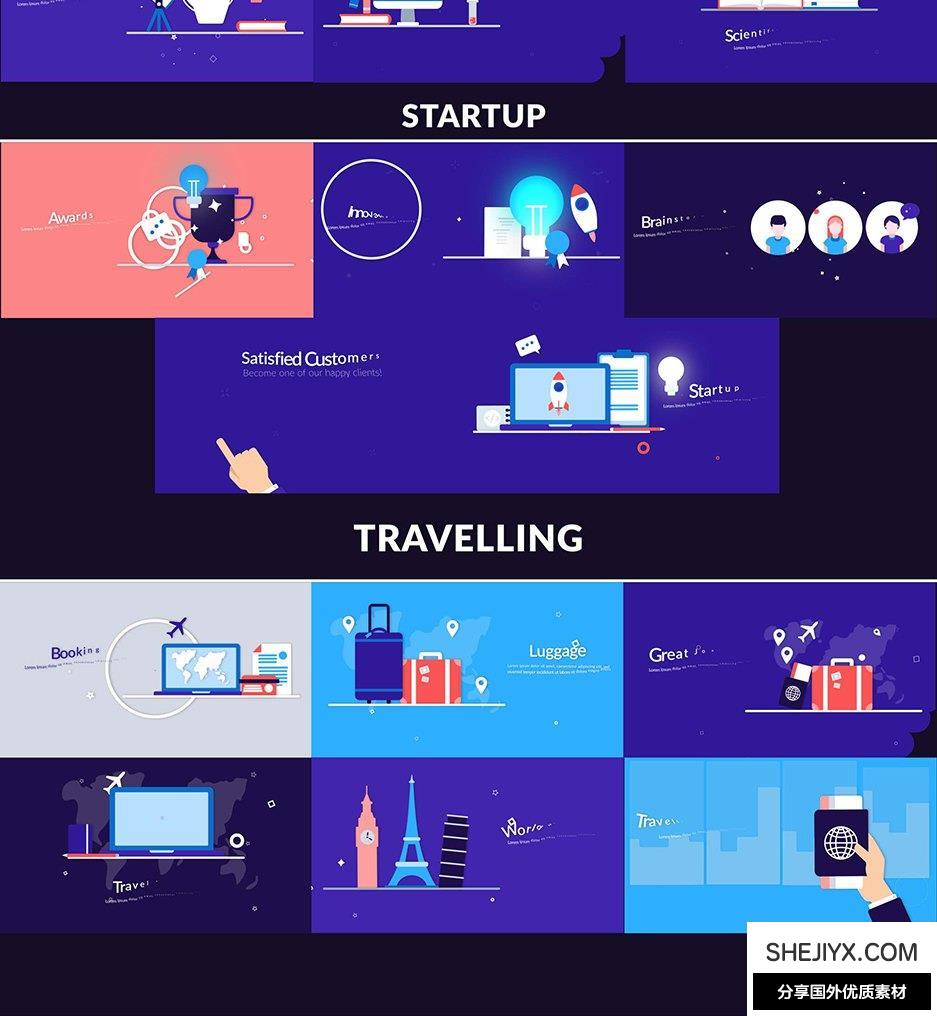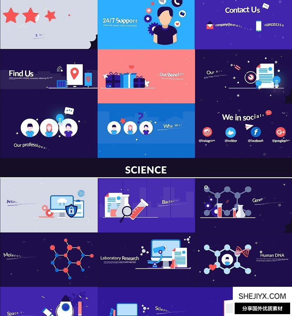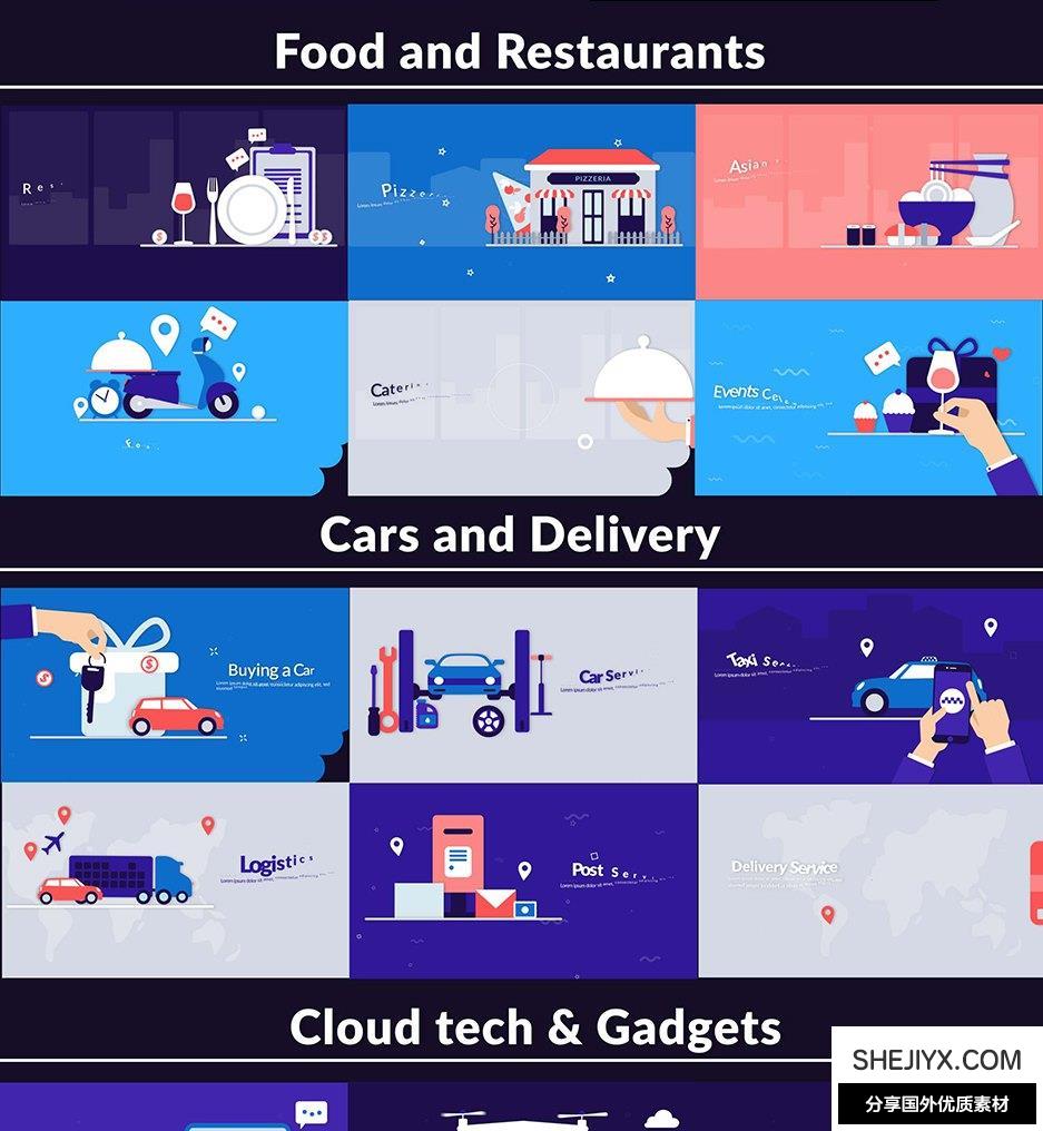 Design Concepts 包含14种类别共100多种场景动画:经济与金融、营销与分析、社交媒体市场营销、药品、信息技术领域、创意机构、创意技术、食物、我们的队伍、房地产、启动、旅行、科学、汽车,550+ 元素,3 种预制配色方案,所有场景都易于定制和调整。包含视频教程。
