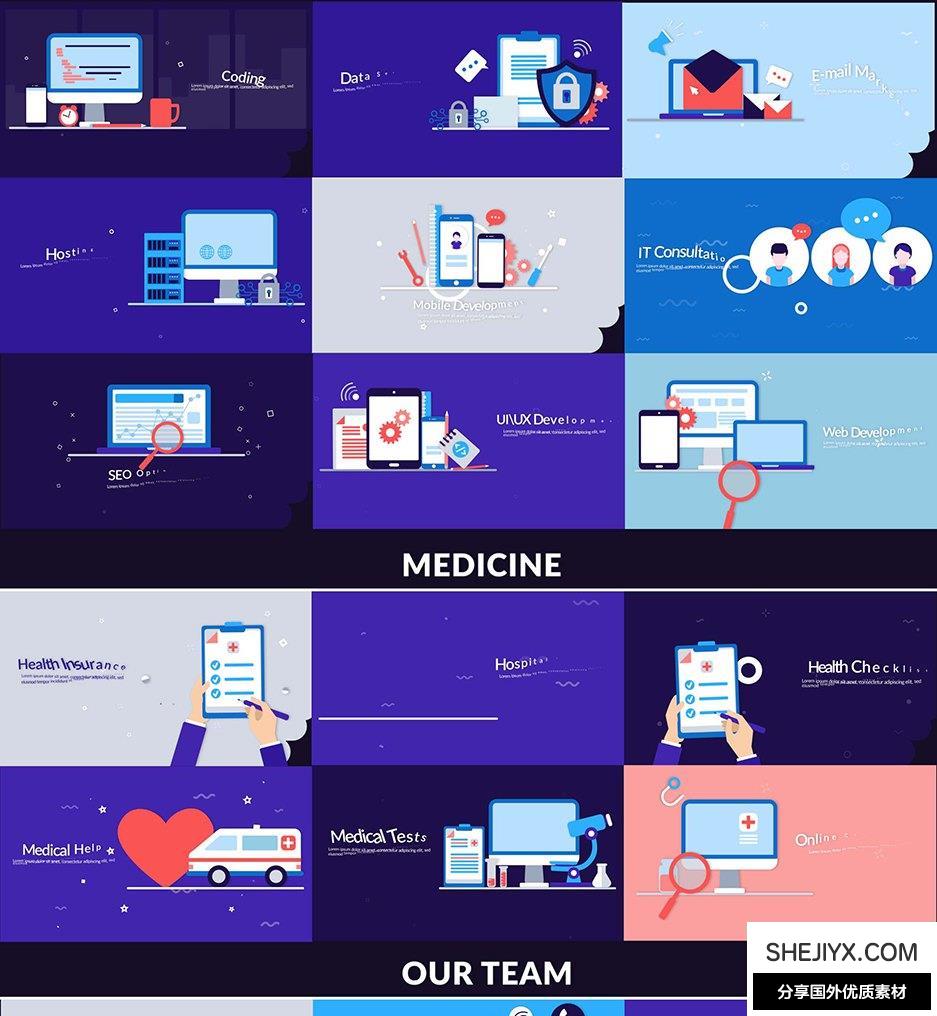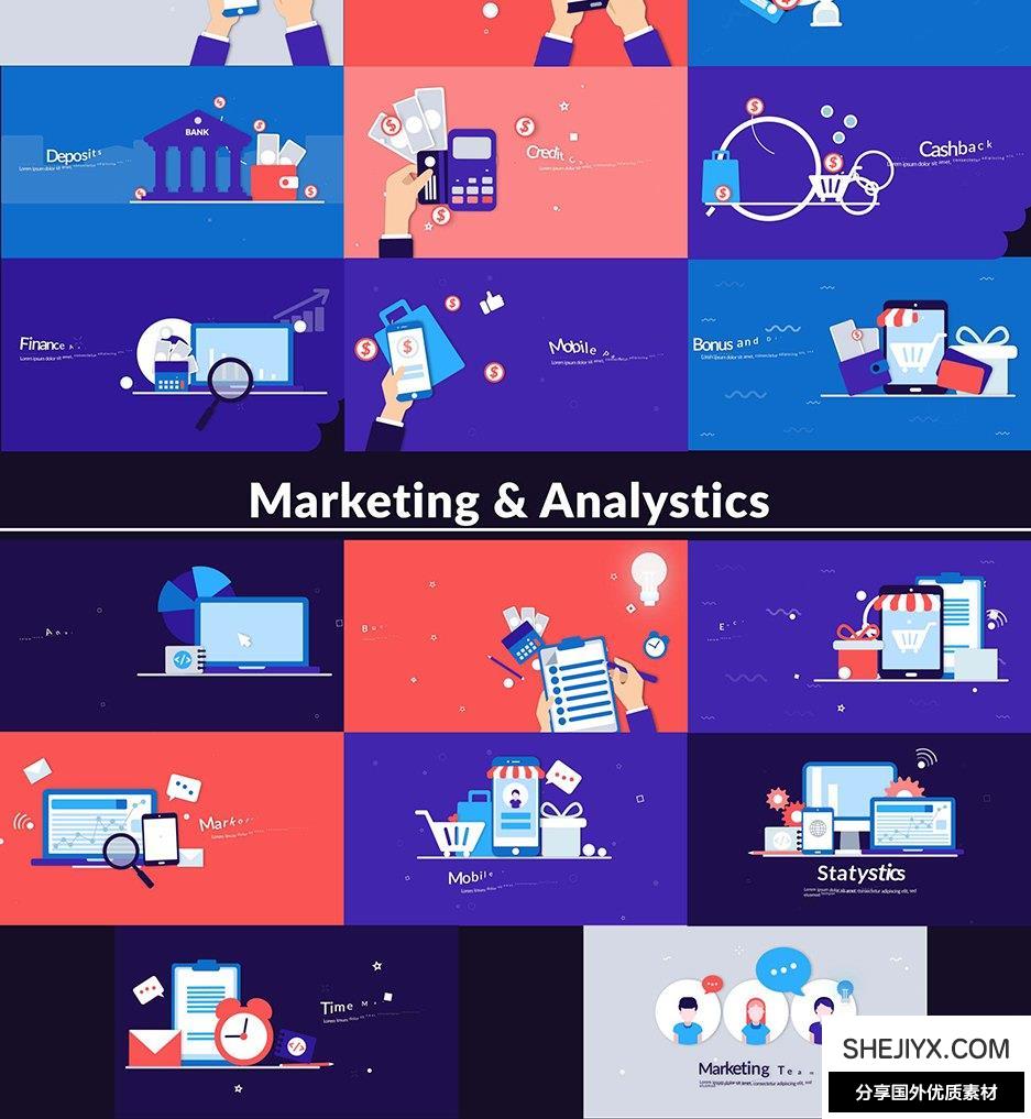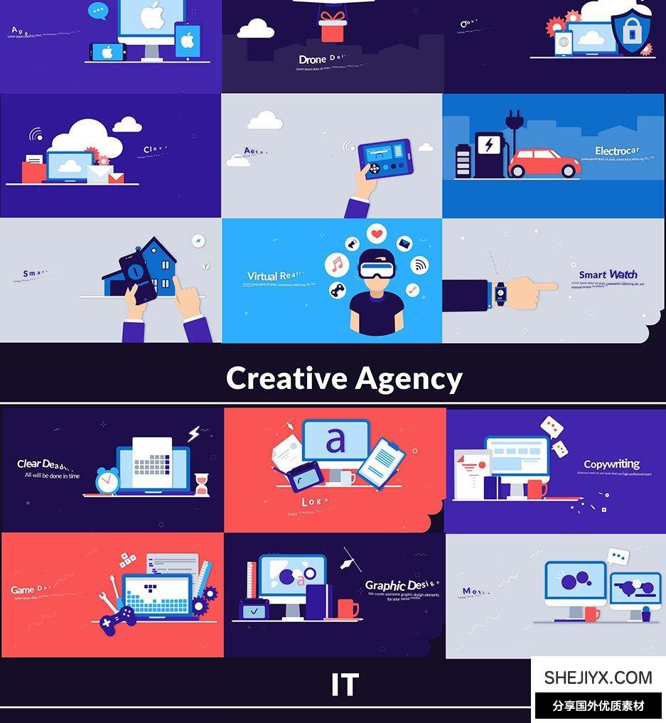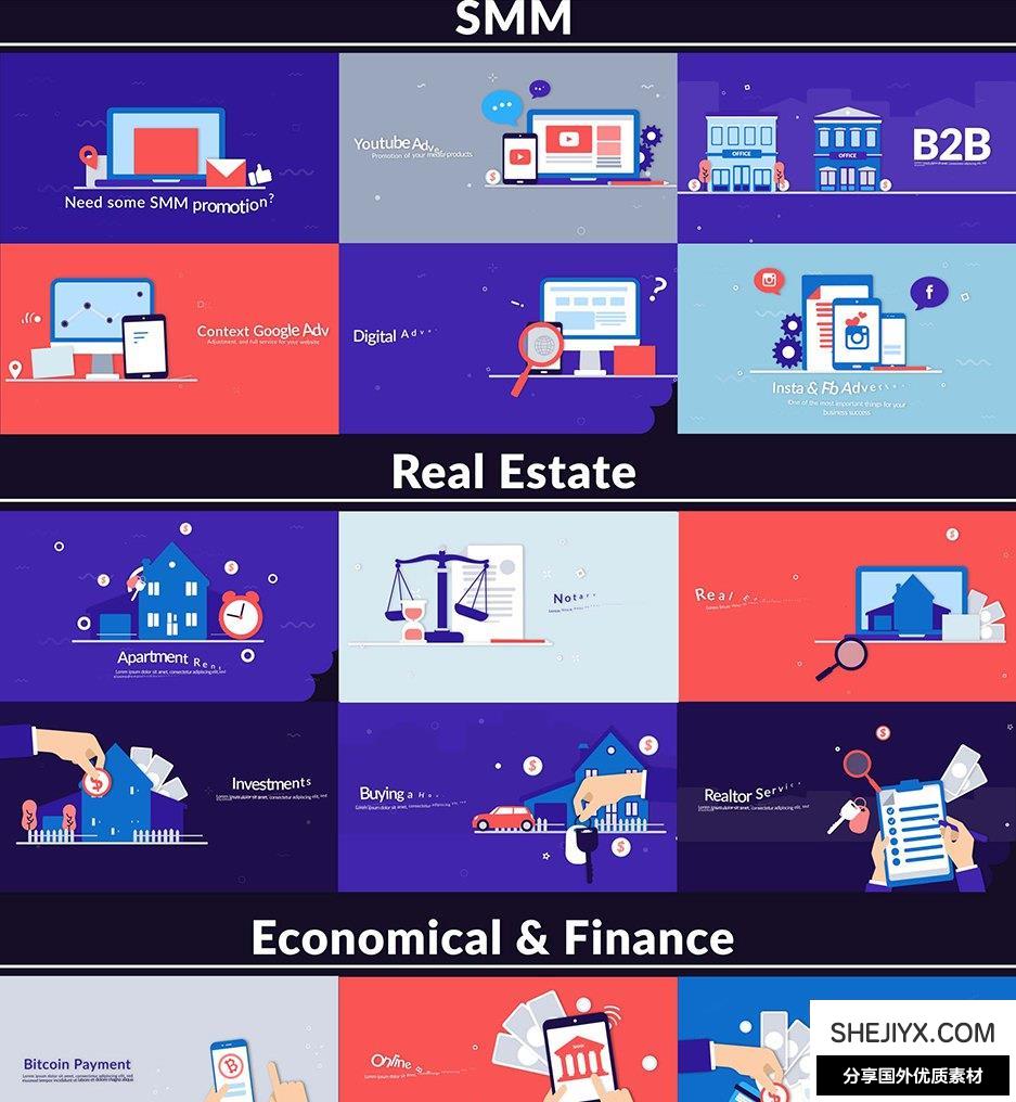 Design Concepts 包含14种类别共100多种场景动画:经济与金融、营销与分析、社交媒体市场营销、药品、信息技术领域、创意机构、创意技术、食物、我们的队伍、房地产、启动、旅行、科学、汽车,550+ 元素,3 种预制配色方案,所有场景都易于定制和调整。包含视频教程。