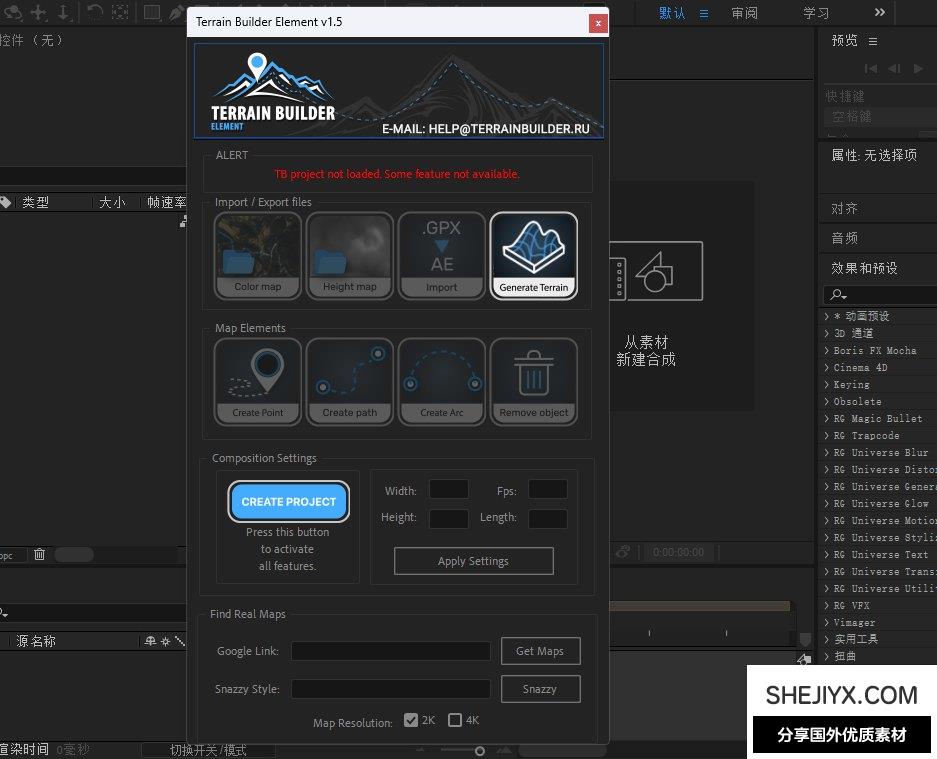 警告!!!:需要 Element 3D 插件(VideoCopilot)。不支持 C4D Lite 包括 Terrain Builder Cinema。脚本使用的谷歌地图国内网络访问可能会受限制。